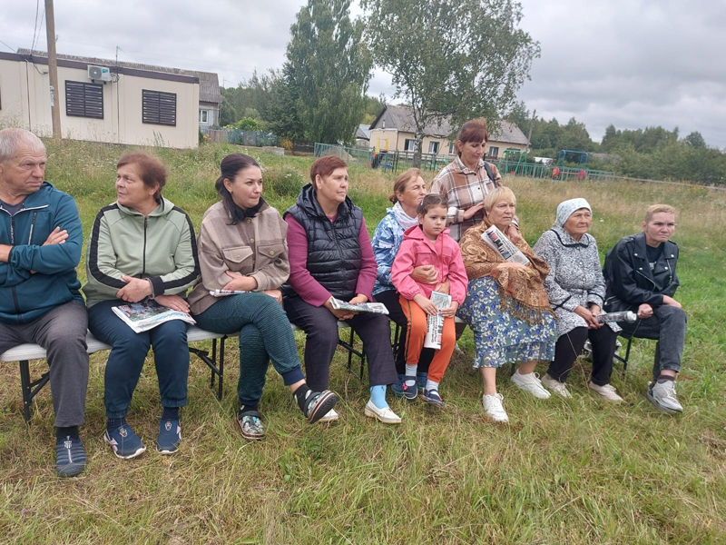 По цепочке передавая друг другу новость о том, что в деревню приедут артисты, селяне, отложив многочисленные домашние хлопоты, нарядившись в красивые платочки и платья, взяв с собой хорошее настроение и цветы с приусадебного участка, собираются на центральную деревенскую усадьбу.