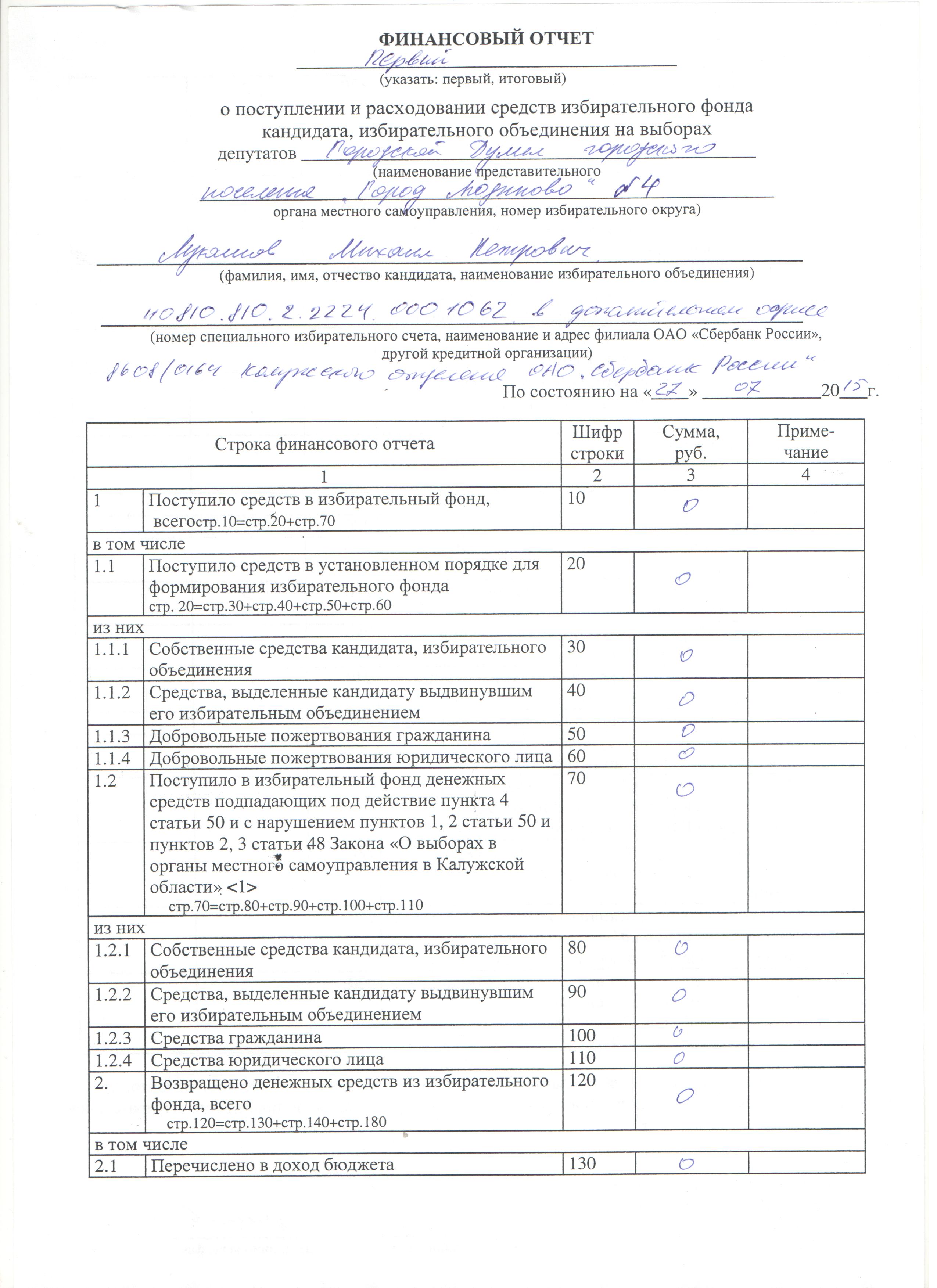 Финансовый отчёт (первый) о поступлении и расходовании средств избирательного фонда кандидата, избирательного объединения на выборах депутатов ГД ГП “Город Людиново” №4 Лукашова Михаила Петровича.